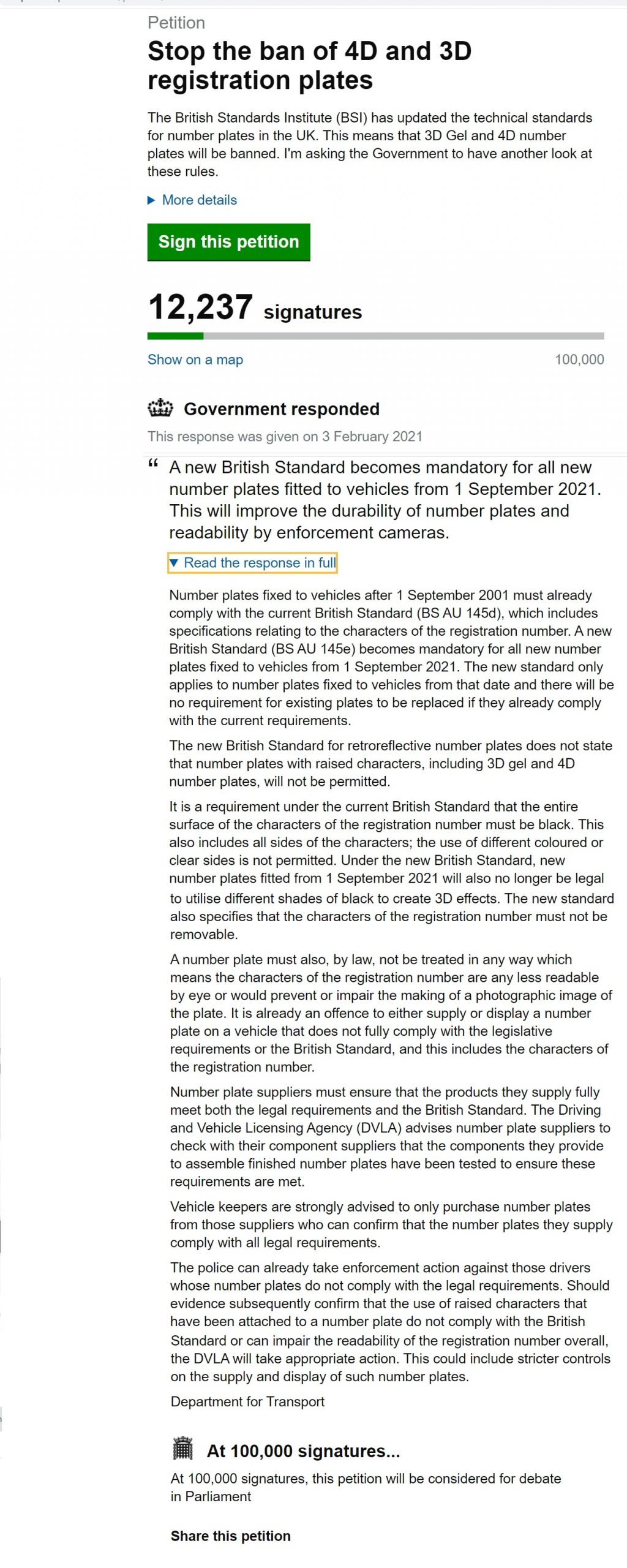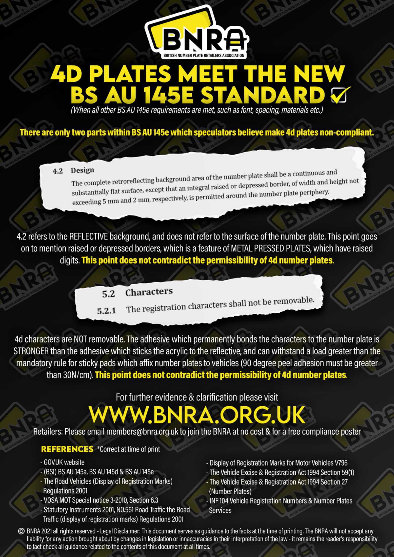 Department for Transport CONFIRMS BS AU 145e does not state that number plates with raised characters will not be permitted